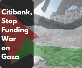 CitiBank: Stop fuelling War on GazaCitibank is one of the dirtiest banks in the world. Israel is one of its most important markets. Citibank has facilitated the purchase of weapons by the Israeli military and we are seeing the devastating results of this. Already the second largest funder of fossil fuels in the world, it is giving more money to fossil fuel companies such as BP who are exploiting the war on Gaza to drill for gas off Gaza's coast. Over 25,000 people have been killed over 100 days of Israel's onslaught in Gaza. Hundreds of thousands are at risk of disease and starvation as Israel refuses to allow aid to enter. Despite this mass suffering, Israel is planning to extract the natural resources off the coast of Gaza through licensing, drilling and extraction. This is all underpinned by funding from Citibank. We know that only outside pressure can stop Israel. Citibank has its main European offices in Belfast and Dublin, and has received over £40 million in public money from Invest NI. We need to take a strong stand across this island against Citi profiting from Israel's brutal attack on the people of Palestine.887 of 1,000 SignaturesCreated by Roan Ellis-O'Neill